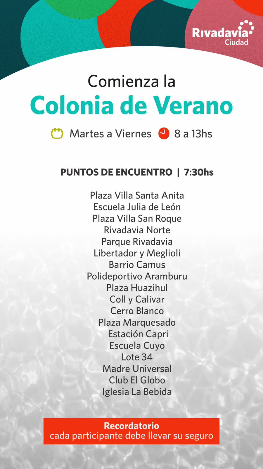 SAN JUAN ARRANCA LA COLONIA DE VERANO EN RIVADAVIA: MARTES 9 DE ENERO En foto central, los lugares y hora de encuentro para llegar al Camping por Ale Ruiz Publicada el lunes 8 de enero de 2024 15 Compartir Municipalidad de Rivadavia informa que lS movilidades estarán en los puntos de encuentro a las 7: 30 horas. 15 Compartir FacebookTwitterGoogle+ReddItWhatsAppPinterestEmail