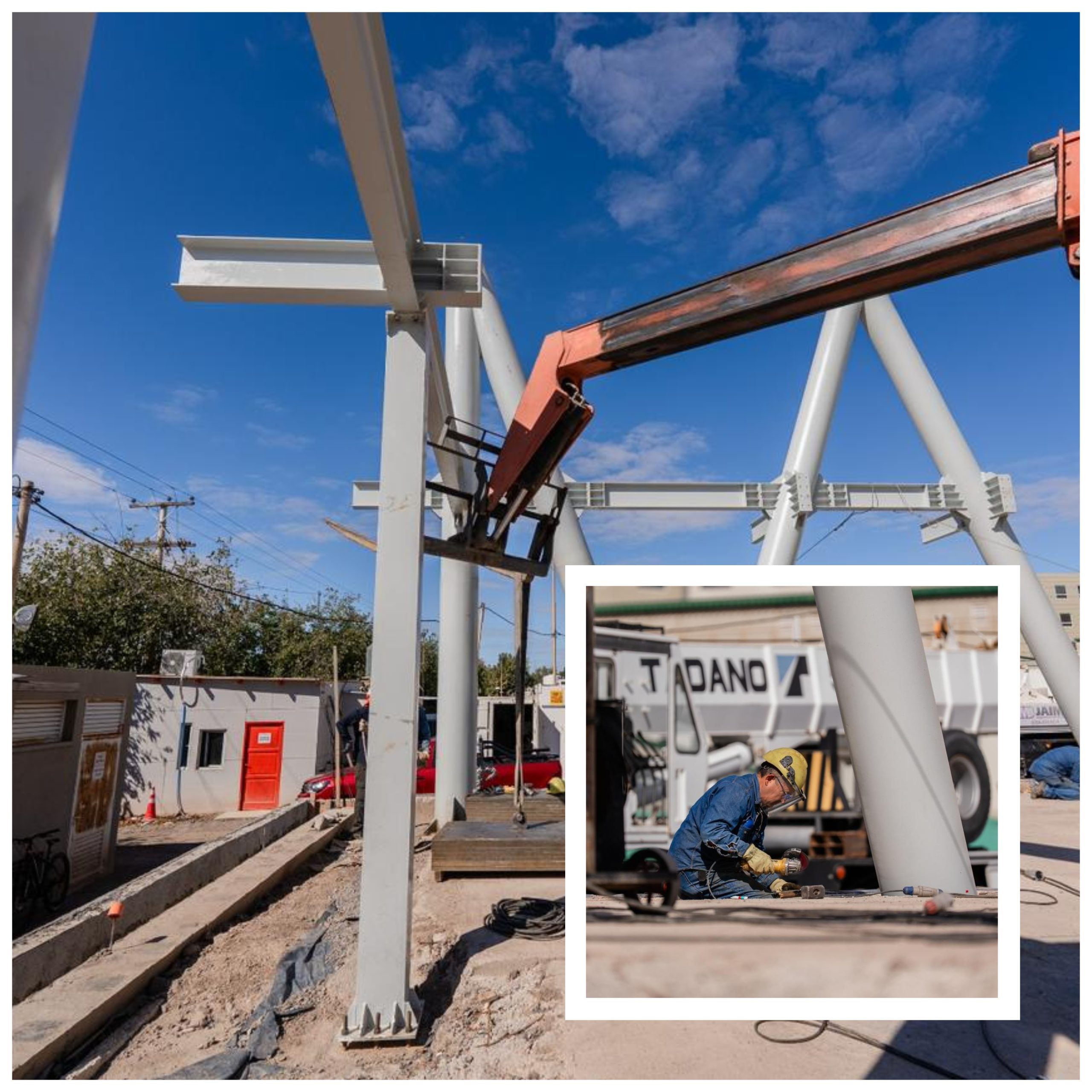 Actualmente, se trabaja en el montaje de columnas tubulares de grandes dimensiones. Debido a su tamaño y peso, estas piezas *se trasladan durante la madrugada* para evitar interferencias en el tránsito y garantizar maniobras más seguras en los accesos al hospital. Una vez en obra, se realiza su montaje con el apoyo de un camión grúa de gran capacidad, permitiendo avanzar con precisión en la conformación de la estructura principal.