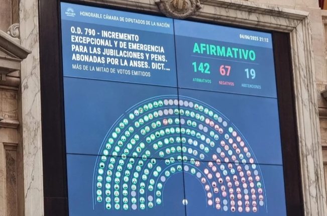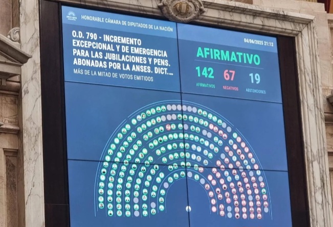 El aumento de los haberes y el bono fue aprobado con 142 votos afirmativos, 67 en contra y 19 abstenciones. Se manifestaron a favor Unión por la Patria, el Frente de Izquierda, la Coalición Cívica, Encuentro Federal y Democracia para Siempre.