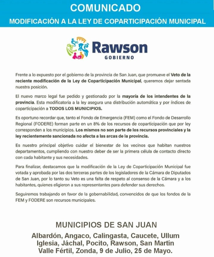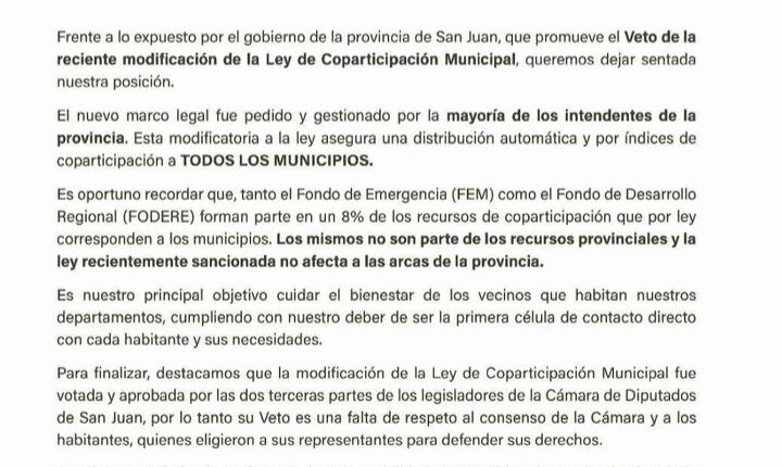 Los intendentes de Albardón, Angaco, Calingasta, Caucete, Ullum, Iglesia, Jáchal, Pocito, Rawson, San Martín, Valle Fértil, Zonda, 9 de Julio, y 25 de Mayo, que responden al senador nacional Sergio Uñac, coincidieron en que esta modificatoria a la ley asegura una distribución automática y por índices de coparticipación a todos los municipios.