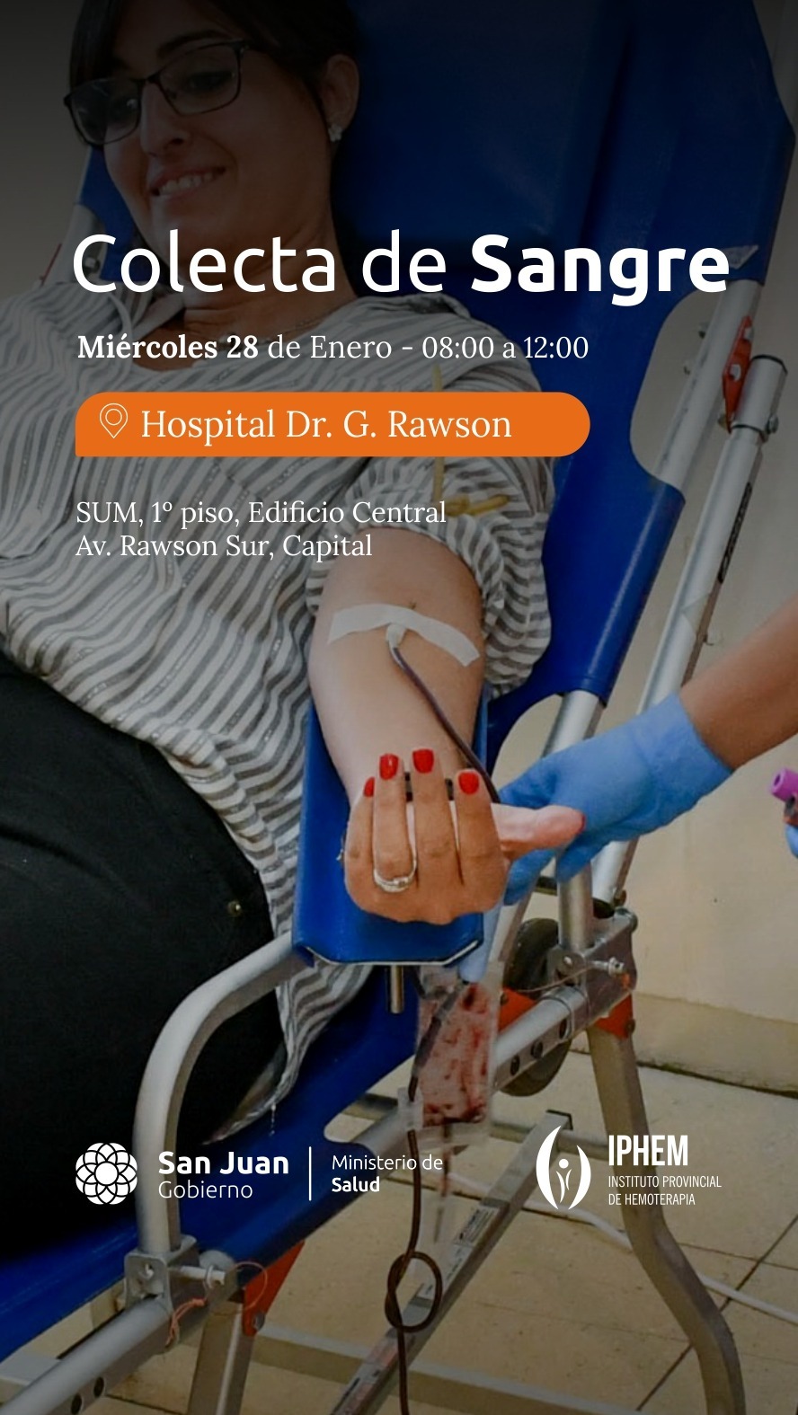 SAN JUAN Ministerio de Salud te invita a donar sangre por Ale Ruiz en martes 27 de enero de 2026 4 Compartir Miércoles 28 de enero 8 a 12 hrs. SUM – Salón de Usos Múltiples – 1ro Piso, Edificio Central. Organizan: I.P.Hem y Hospital Rawson Donar sangre salva vidas. 4 Compartir FacebookTwitterGoogle+ReddItWhatsAppPinterestEmail