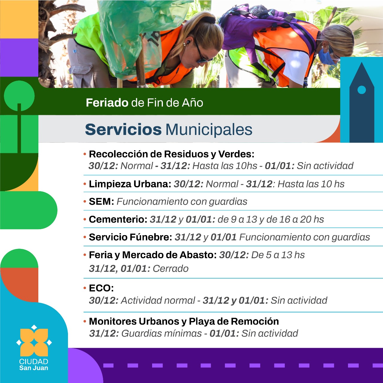 MUNICIPALIDAD DE LA CIUDAD DE SAN JUAN INFORMA LOS SERVICIOS A BRINDAR DURANTE EL ÚLTIMO FIN DE SEMANA DEL AÑO.