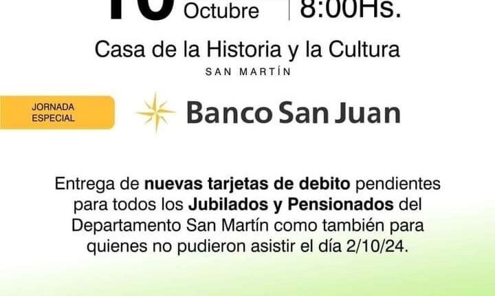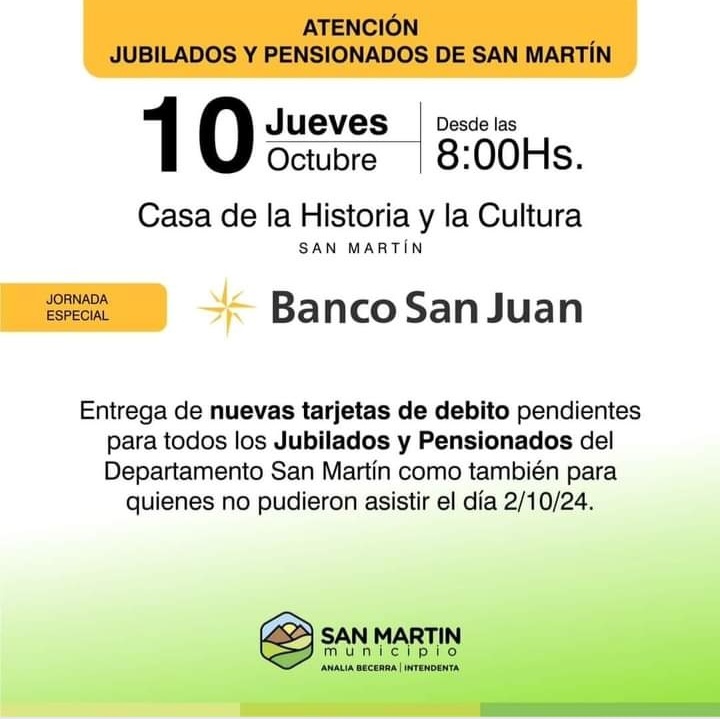 La Municipalidad de San Martín informa que, debido a la gran demanda, se ha programado una nueva jornada de entrega de tarjetas de débito del Banco San Juan para nuestros jubilados.