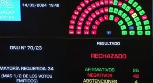 El Decreto de Necesidad y Urgencia (DNU) 70/2023 fue rechazado hoy por el Senado de la Nación por 42 votos negativos a 25 afirmativos. Este resultado vuelve a tensar la relación entre el Gobierno nacional y el Congreso de la Nación, luego de la reunión que se realizó hace poco menos de una semana entre los gobernadores y referentes del Poder Ejecutivo, en la Casa Rosada.