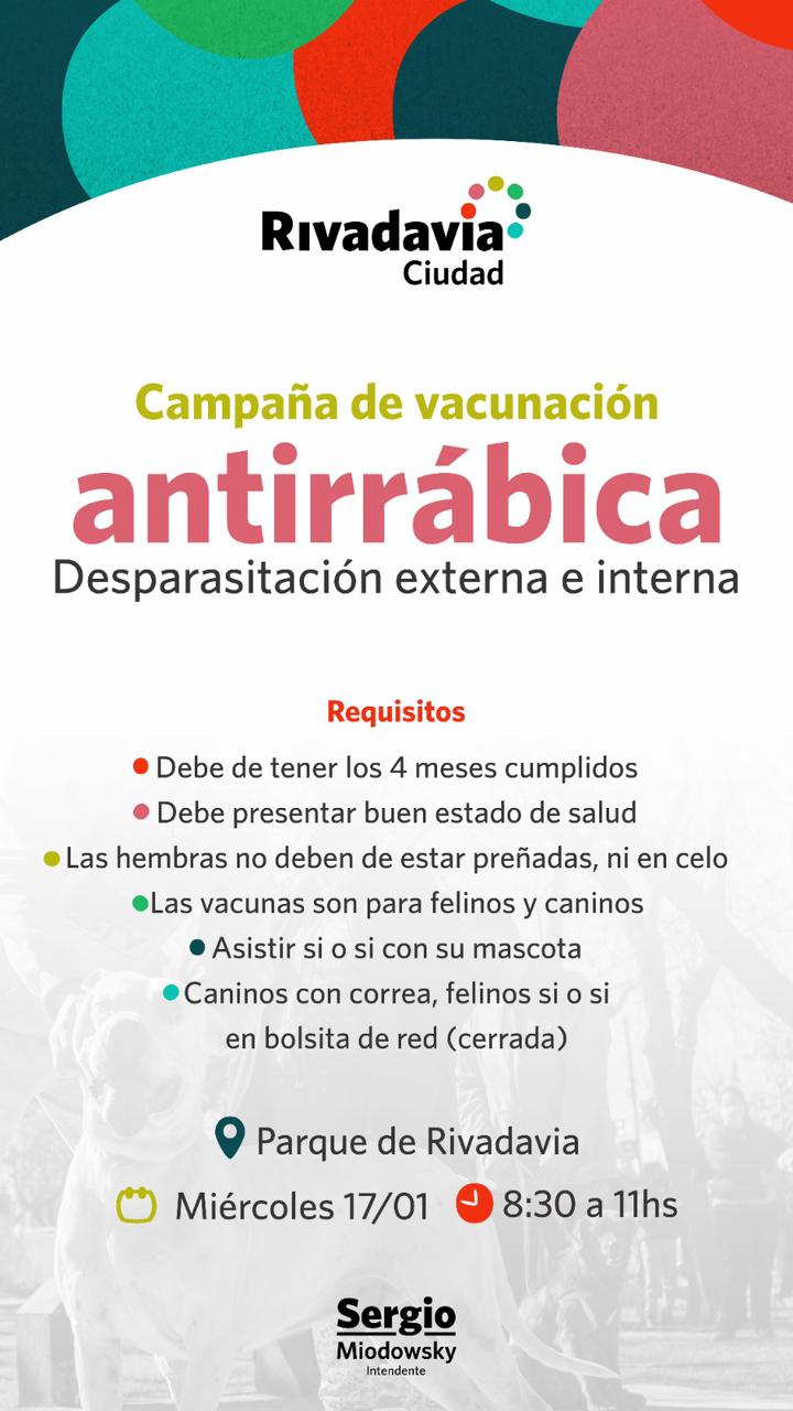 Este miércoles 17 de enero, arranca la campaña de Vacunación Antirrábica y además desparacitación interna y externa en el Parque de Rivadavia.